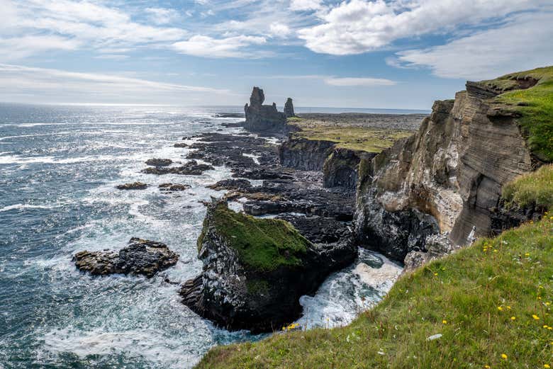 Continuaremos hacia los pináculos de basalto de Lóndrangar, unas torres volcánicas que emergen del mar y sirven de hogar a miles de aves marinas. Después, llegaremos al pintoresco pueblo de Arnarstapi. Recorreremos el sendero que bordea los acantilados para ver el arco natural de Gatklettur y la imponente estatua de Bárður Snæfellsás, el guardián de la península.