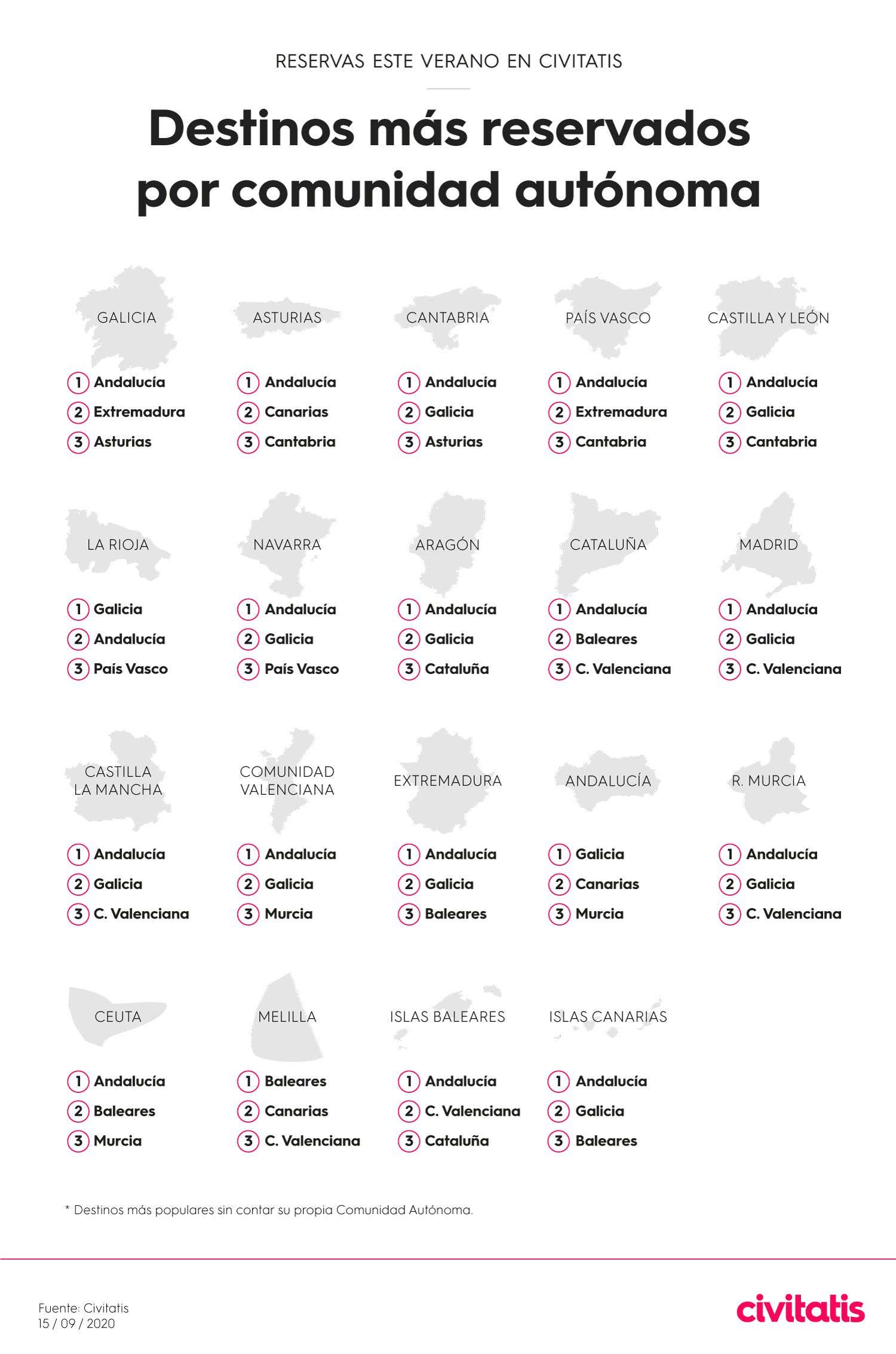 En cuanto a los destinos más visitados por cada comunidad autónoma, la tendencia sigue siendo la misma que a nivel nacional, destacando Andalucía y Galicia como las regiones más visitadas a nivel general. En las estadísticas también se ha notado el alza del turismo de proximidad, ya que muchos de los españoles han optado por visitar las comunidades autónomas colindantes a la suya.