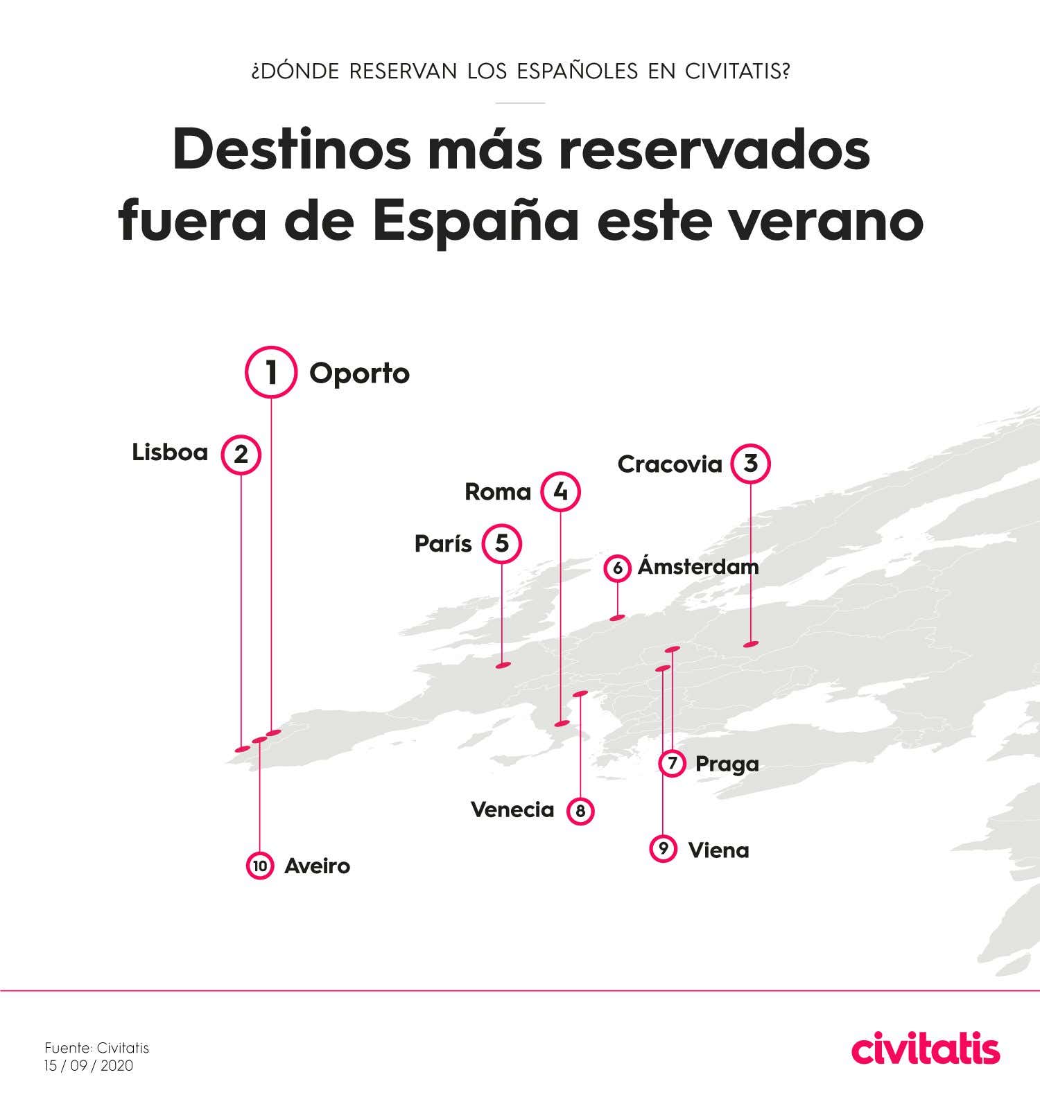 Sin embargo, estas estadísticas muestran también que no todas las personas se han quedado solamente en España: Portugal, con Oporto y Lisboa a la cabeza, ha sido el país extranjero más visitado por los españoles. Otras ciudades como Cracovia, Roma o París también han contado con visitantes originarios de España, pese a las restricciones que han ido estableciendo algunos países de la Unión Europea.