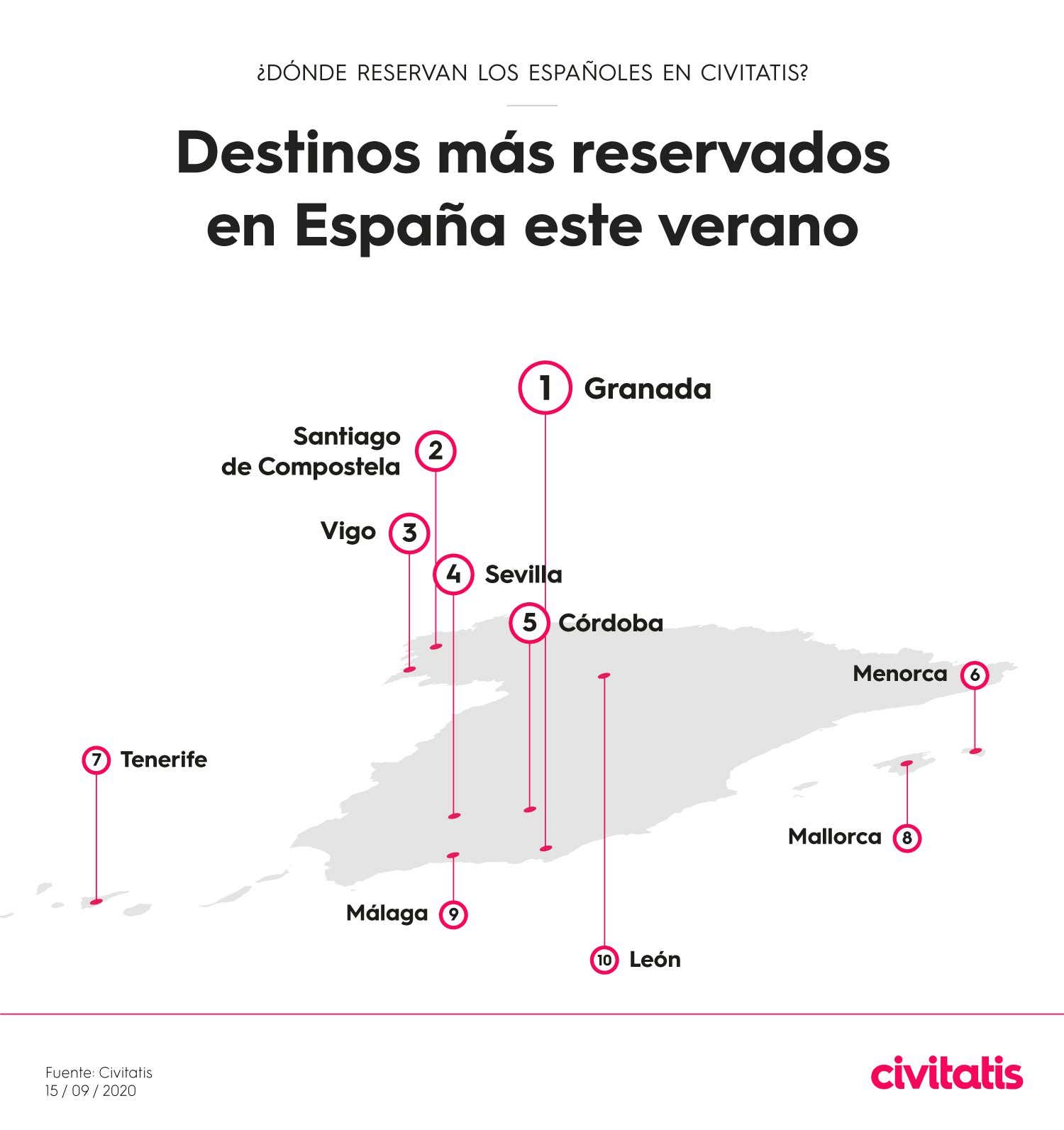 Según las estadísticas internas de Civitatis, el 65% de las reservas efectuadas a través de su plataforma han tenido lugar este año en el territorio español, siendo Granada, Santiago de Compostela y Vigo los destinos predilectos entre los viajeros españoles. En comparación con el verano de 2019, resulta llamativo a la par que comprensible que los destinos españoles hayan copado las reservas de Civitatis durante estos meses estivales, ya que en el año anterior había que remontarse hasta el duodécimo puesto del listado para encontrar una ciudad española (Madrid).