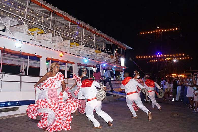 Na hora indicada, nos encontraremos no cais Portofino para dar início a uma noite inesquecível. Antes mesmo de subir ao barco de dois andares, você será recebido por um animado grupo de danças típicas colombianas, que já antecipa o clima da experiência. Em seguida, todos a bordo: é hora de aproveitar uma verdadeira festa caribenha navegando pela baía de Cartagena das Índias.