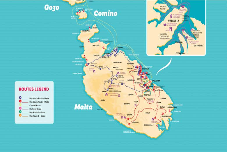 The northern route takes in northern and eastern Malta, with sights including Silema, Mosta, Ta Qali, Mdina and Rabat. And with the southern route, you can explore La Valeta and the famous Three Cities, which lie just outside the capital: Cospicua, Senglea and Birgu. And you can visit the Tarxien temples and the Blue Grotto.