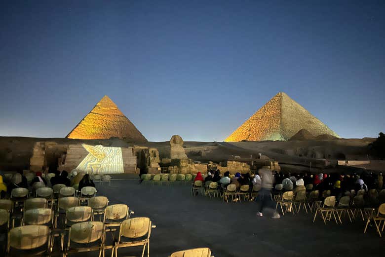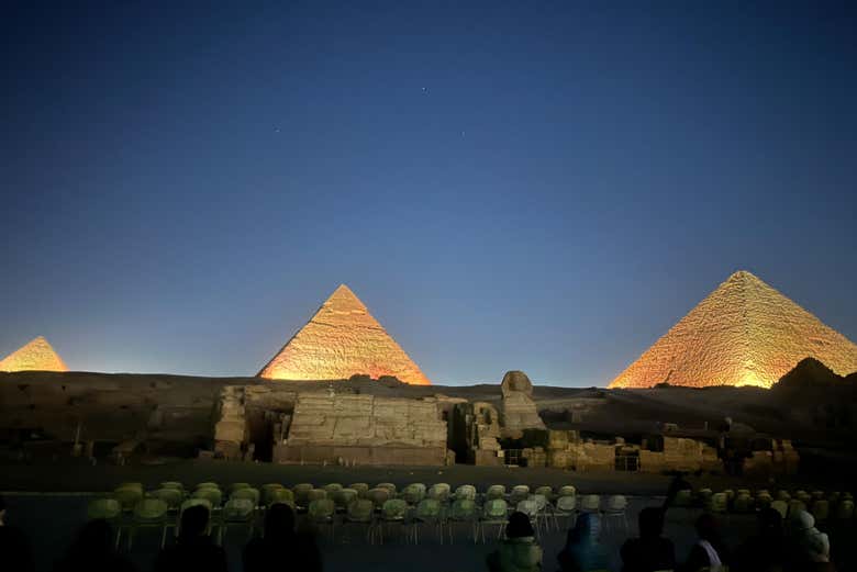 Una vez pasemos a recogeros por vuestro hotel de El Cairo nos dirigiremos al conjunto arqueológico de las pirámides de Giza. Durante aproximadamente una hora disfrutaremos de un espectáculo de luz y sonido con diversas proyecciones láser sobre los principales monumentos del enclave.