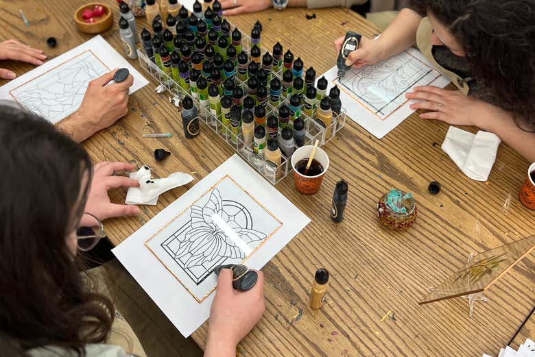 Con cada trazo, veremos cómo el dibujo cobra vida. Por momentos, nos detendremos para corregir y afinar el pulso. ¿Sabíais que en la pintura sobre vidrio no se trabaja de oscuro a claro, sino justo al revés? Un pequeño giro de lógica que la hace tan fascinante como exigente.