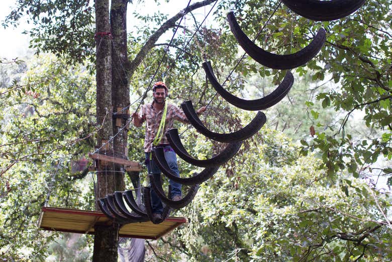 Una vez estemos todos, nos dirigiremos al parque donde se encuentra el circuito de puentes colgantes, a 25 minutos de trayecto. Ubicado en el corazón del bosque de la Sierra del Tigre, al llegar nos pondremos todo el equipo necesario y tras escuchar una breve explicación sobre la actividad, ¡empezamos la aventura en los puentes colgantes!