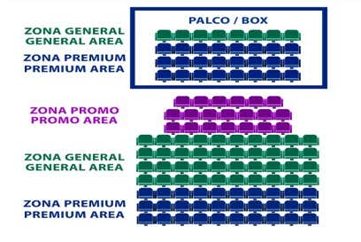 - Entrada General: son los asientos de color verde, ubicados en la zona intermedia del patio de butacas y en la fila superior del área de palcos.