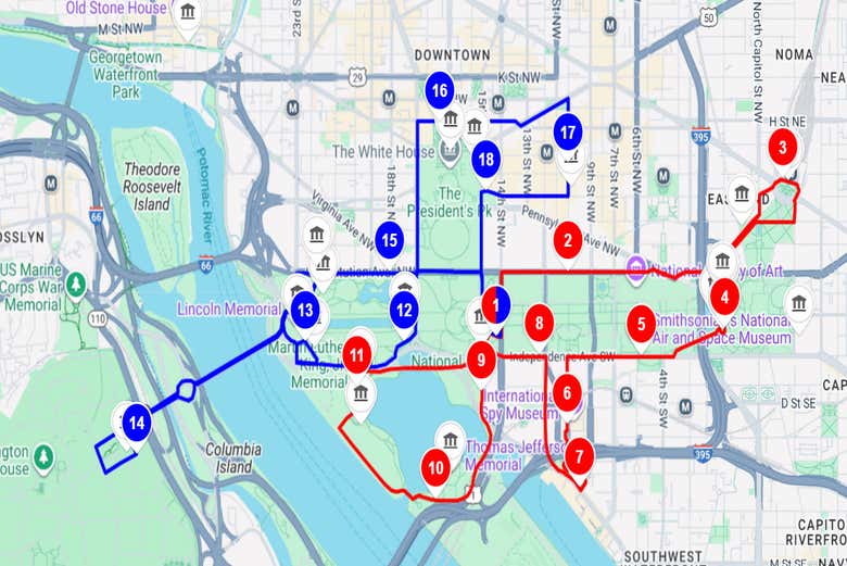 Algunas de las paradas más interesantes son el Capitolio, la Casa Blanca, el Monumento a Lincoln, el Monumento a Washington (el famoso obelisco), el Pentágono y el Cementerio de Arlington.