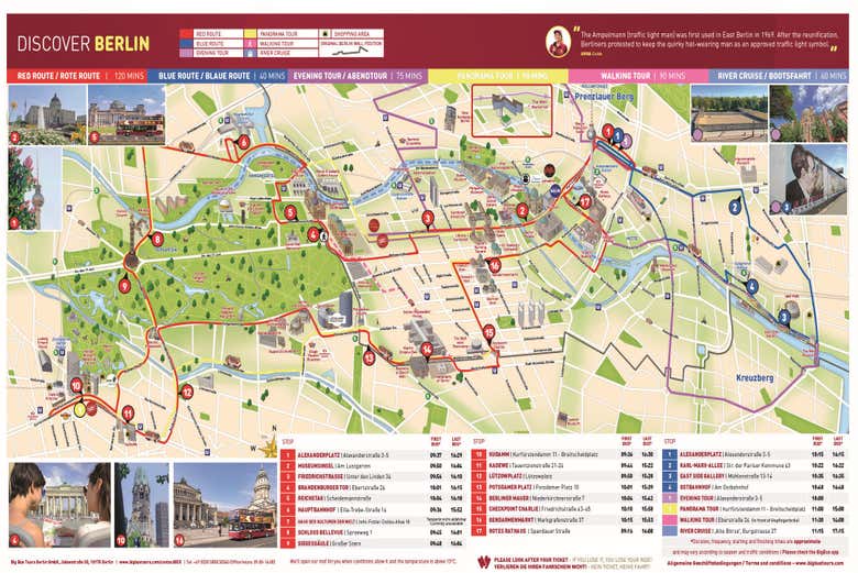 - Ligne bleue : il s'agit d'un itinéraire de 4 arrêts à travers l'est de Berlin. Pendant son trajet de 40 minutes, le bus s'arrête à des points emblématiques tels que l'Alexanderplatz ou l'East Side Gallery.