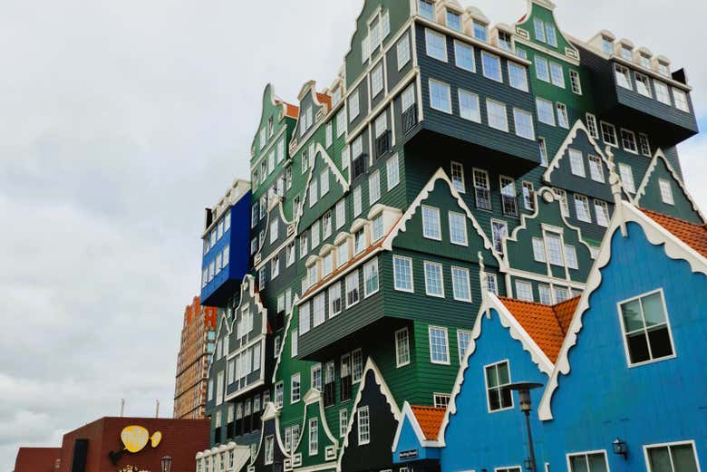 Après la prise en charge à votre hôtel de Zaandam à l'heure convenue, vous partirez en voiture privée à la découverte des paysages emblématiques des Pays-Bas, des ingénieux polders aux villes historiques. Votre premier arrêt se fera devant l'impressionnant Inntel Hotel, célèbre pour sa façade qui ressemble à des briques LEGO empilées. Conçu par l'architecte Wilfried van Winden, ce bâtiment combine environ 70 maisons traditionnelles vertes de la région du Zaan, un hommage unique à l'architecture locale où se mêlent créativité, tradition et modernité.