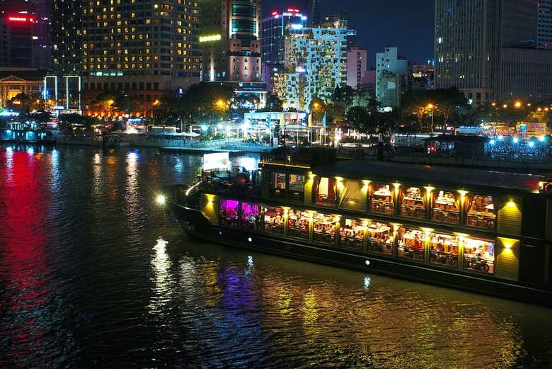 Alla conclusione dello spettacolo, salperemo a bordo di una barca tipica vietnamita per goderci una tranquilla crociera serale sul fiume Saigon, una delle principali arterie fluviali della città.