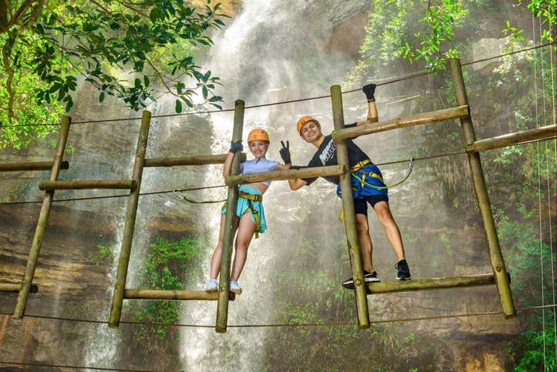 Empezaremos deslizándonos por una red de tirolinas, y después cruzaremos puentes colgantes que se mecen con el viento. ¡Esto es solo el comienzo! Después, avanzaremos por túneles colgantes, descenderemos haciendo en rápel y practicaremos el salto Tarzán, donde el vértigo se transforma en euforia.