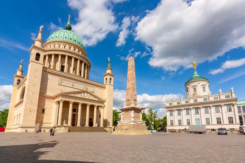 En primer lugar, recorreremos la plaza y contemplaremos la fachada de la iglesia, que fue construida en la primera mitad del siglo XIX. Los bombardeos aéreos sobre Potsdam durante la Segunda Guerra Mundial afectaron gravemente al templo, que fue reconstruido en 1984 para volver a adquirir su esplendor.