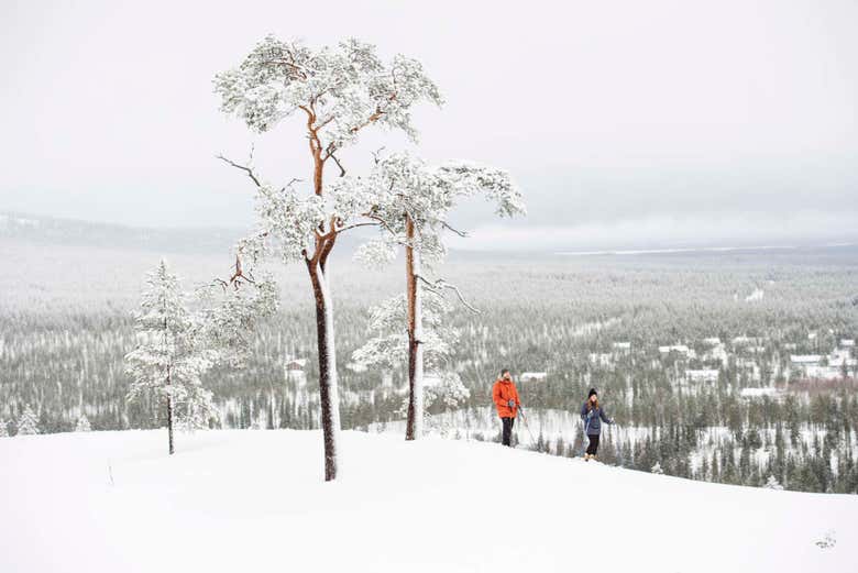 Colocaremos os esquis, pegaremos os bastões e começaremos a explorar a paisagem invernal do Parque Nacional Pyhä-Luosto. Durante duas horas atravessaremos as brancas paisagens naturais enquanto desfrutamos da paz e tranquilidade desse lugar.